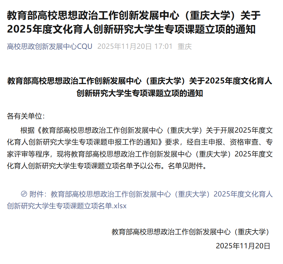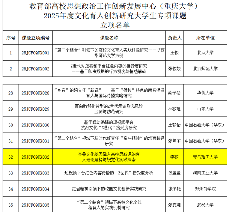 近日,教育部高校思想政治工作创新发展中心(重庆大学)正式公布 2025 年度文化育人创新研究大学生专项课题立项名单。由我们张建军教授指导、2024 级硕士研究生李敏同学主持申报的《齐鲁文化基因融入高校思政课的育人理论建构与视觉化实践探索》课题凭借鲜明的研究特色、扎实的理论基础和创新的实践思路,成功获批立项,为学院思政教育研究再添亮眼成果。